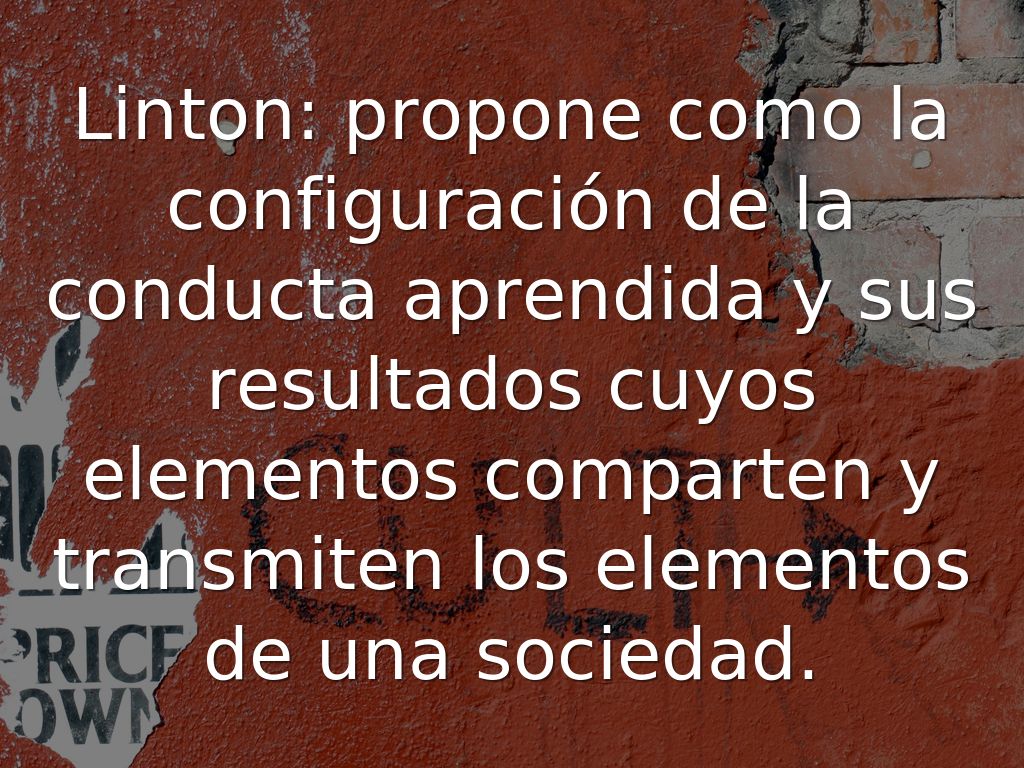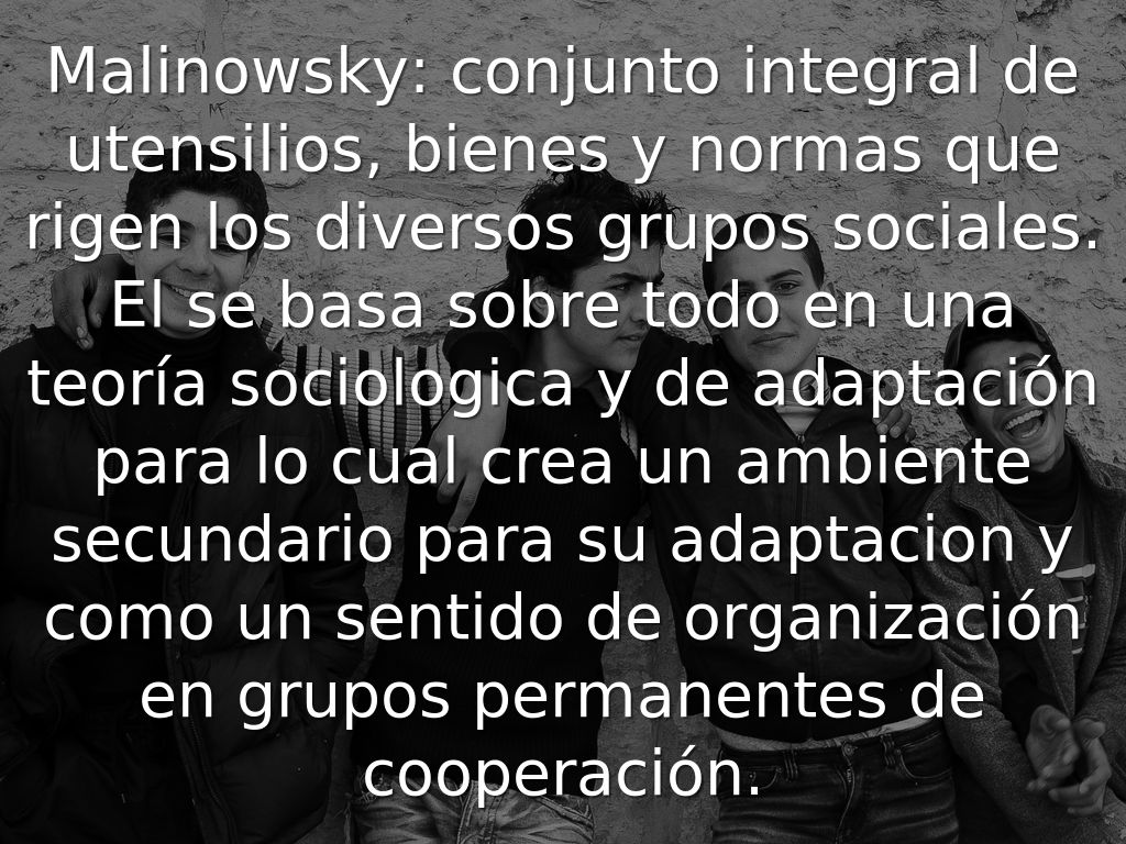 Malinowsky: conjunto integral de utensilios, bienes y normas que rigen los diversos grupos sociales. El se basa sobre todo en una teoría sociologica y de adaptación para lo cual crea un ambiente secundario para su adaptacion y como un sentido de organización en grupos permanentes de cooperación.