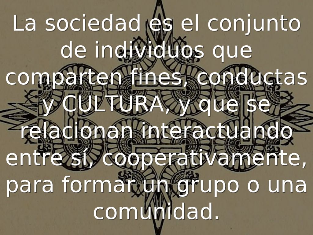 La sociedad es el conjunto de individuos que comparten fines, conductas y CULTURA, y que se relacionan interactuando entre sí, cooperativamente, para formar un grupo o una comunidad.