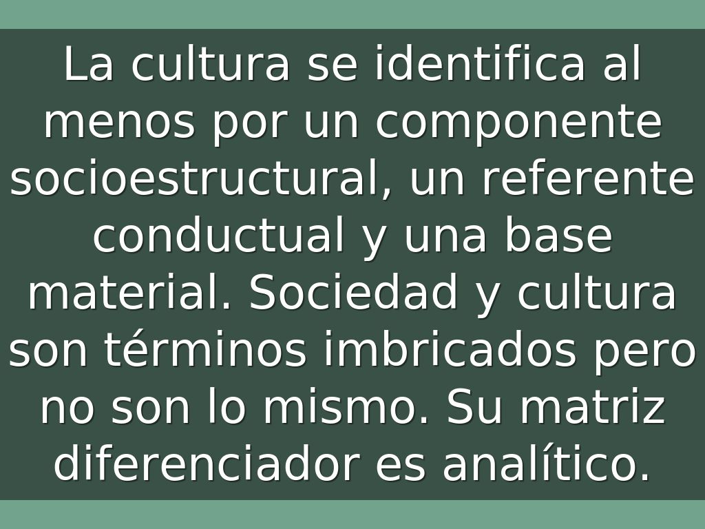 La cultura se identifica al menos por un componente socioestructural, un referente conductual y una base material. Sociedad y cultura son términos imbricados pero no son lo mismo. Su matriz diferenciador es analítico.