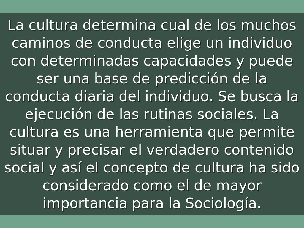 La cultura determina cual de los muchos caminos de conducta elige un individuo con determinadas capacidades y puede ser una base de predicción de la conducta diaria del individuo. Se busca la ejecución de las rutinas sociales. La cultura es una herramienta que permite situar y precisar el verdadero contenido social y así el concepto de cultura ha sido considerado como el de mayor importancia para la Sociología.