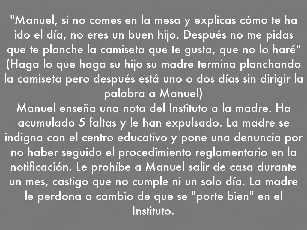 "Manuel, si no comes en la mesa y explicas cómo te ha ido el día, no eres un buen hijo. Después no me pidas que te planche la camiseta que te gusta, que no lo haré" (Haga lo que haga su hijo su madre termina planchando la camiseta pero después está uno o dos días sin dirigir la palabra a Manuel)