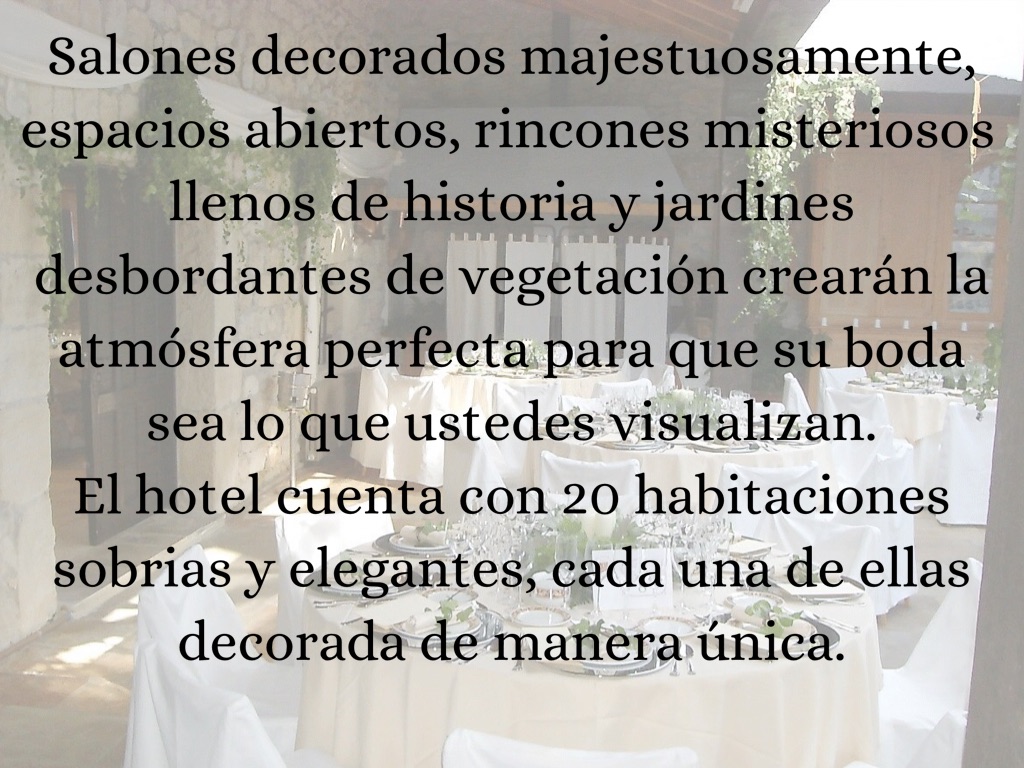 Salones decorados majestuosamente, espacios abiertos, rincones misteriosos llenos de historia y jardines desbordantes de vegetación crearán la atmósfera perfecta para que su boda sea lo que ustedes visualizan.