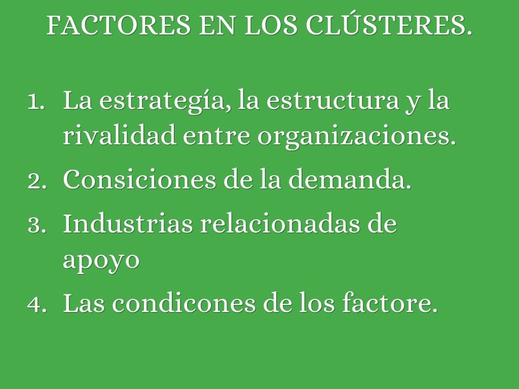 Clústeres: Grupo de organizaciones que se 'presentan en ciertas ubicaciones creando un ecosistema de negocios. Consentraciones geográficas de compañias interconectadas en un campo particular.