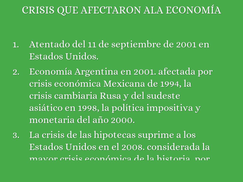 Economía Argentina en 2001. afectada por crisis económica Mexicana de 1994, la crisis cambiaria Rusa y del sudeste asiático en 1998, la política impositiva y monetaria del año 2000.