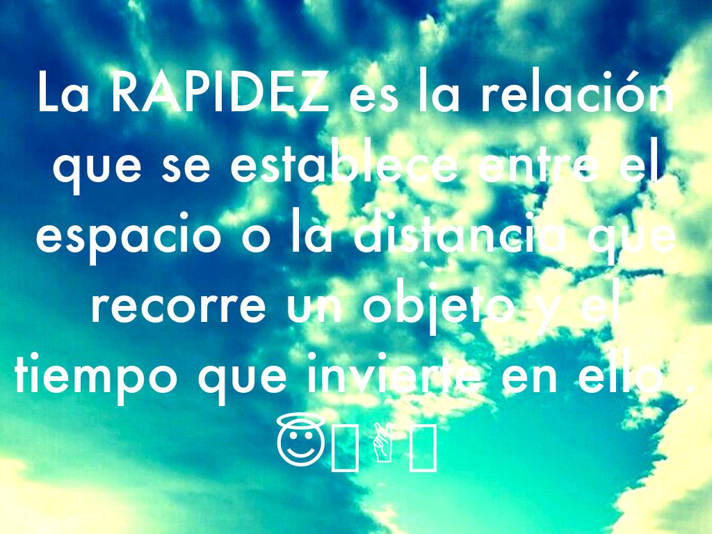 La RAPIDEZ es la relación que se establece entre el espacio o la distancia que recorre un objeto y el tiempo que invierte en ello .