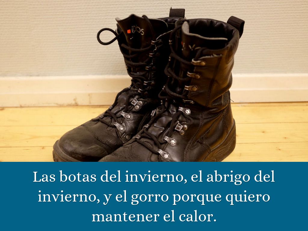 Las botas del invierno, el abrigo del invierno, y el gorro porque quiero mantener el calor.