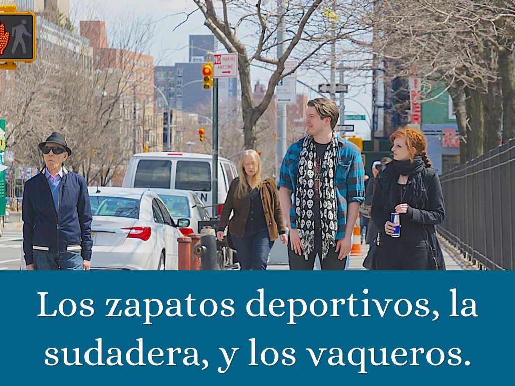 Los zapatos deportivos, la sudadera, y los vaqueros.