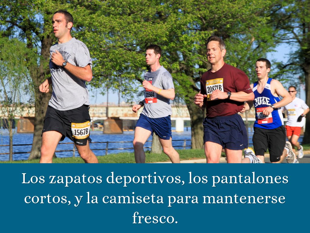 Los zapatos deportivos, los pantalones cortos, y la camiseta para mantenerse fresco.