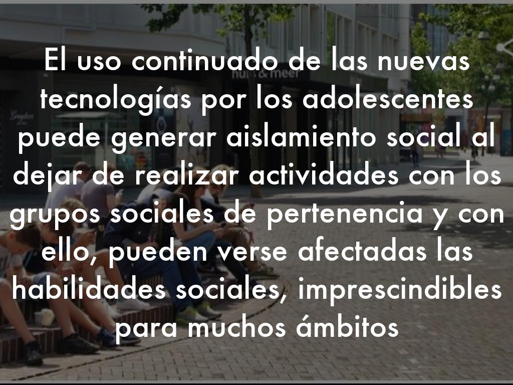 El uso continuado de las nuevas tecnologías por los adolescentes puede generar aislamiento social al dejar de realizar actividades con los grupos sociales de pertenencia y con ello, pueden verse afectadas las habilidades sociales, imprescindibles para muchos ámbitos