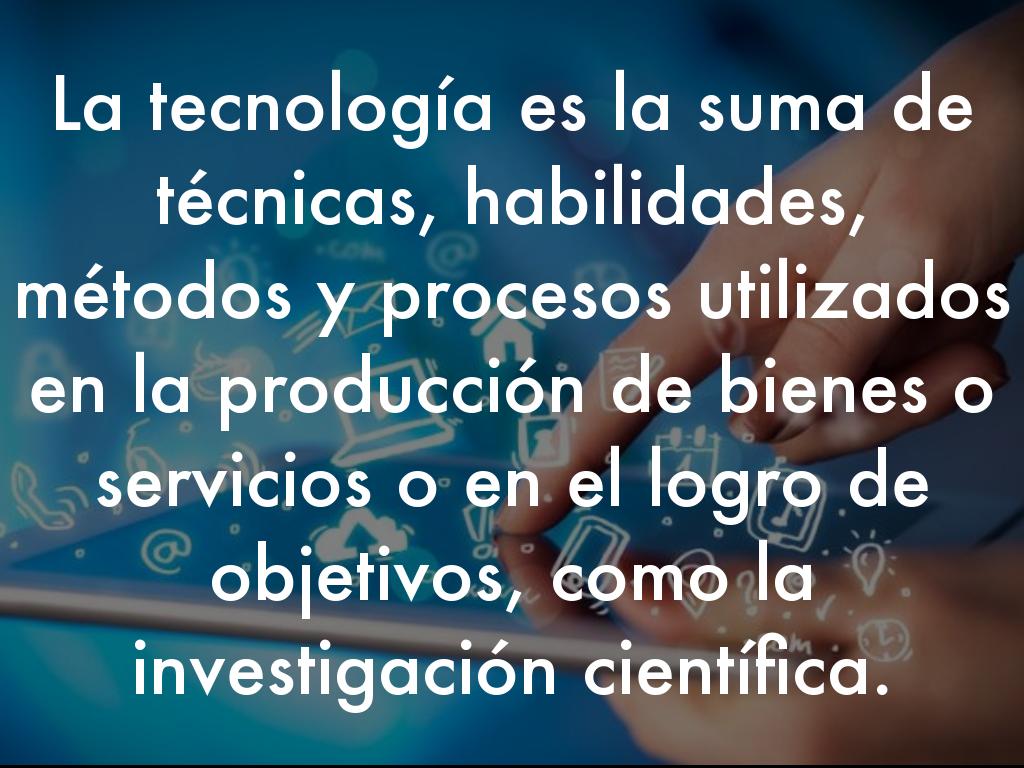 La tecnología es la suma de técnicas, habilidades, métodos y procesos utilizados en la producción de bienes o servicios o en el logro de objetivos, como la investigación científica.