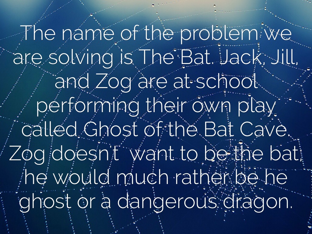 The name of the problem we are solving is The Bat. Jack, Jill, and Zog are at school performing their own play called Ghost of the Bat Cave. Zog doesn't want to be the bat; he would much rather be he ghost or a dangerous dragon.