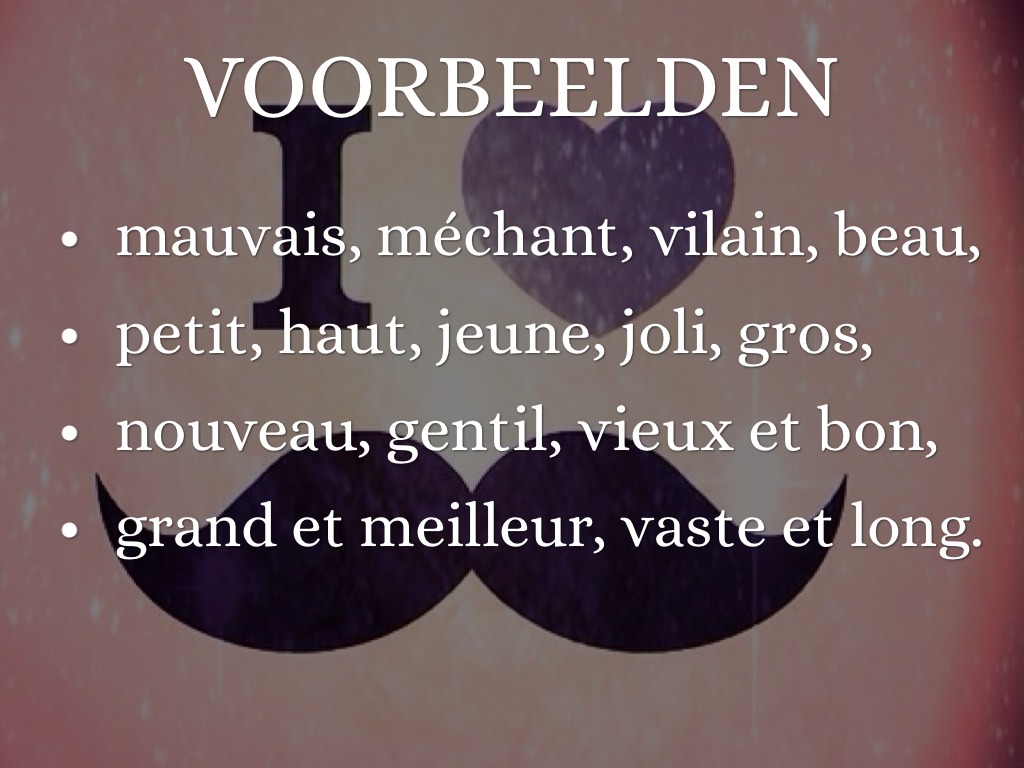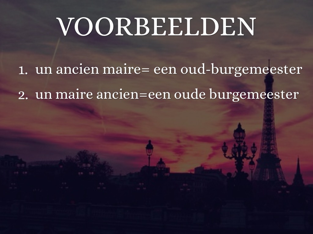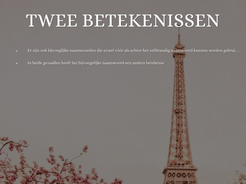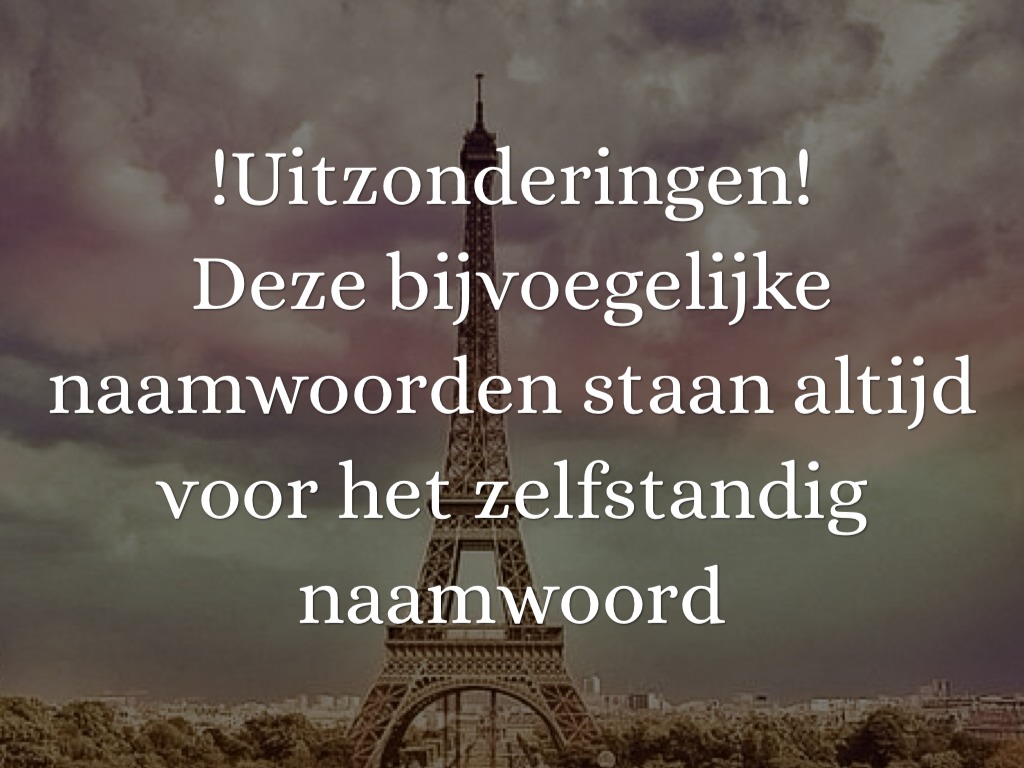 - Er zijn ook bijvoeglijke naamwoorden die zowel v贸贸r als achter het zelfstandig naamwoord kunnen worden gebruikt.