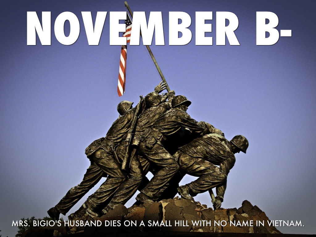 MRS. BIGIO'S HUSBAND DIES ON A SMALL HILL WITH NO NAME IN VIETNAM.