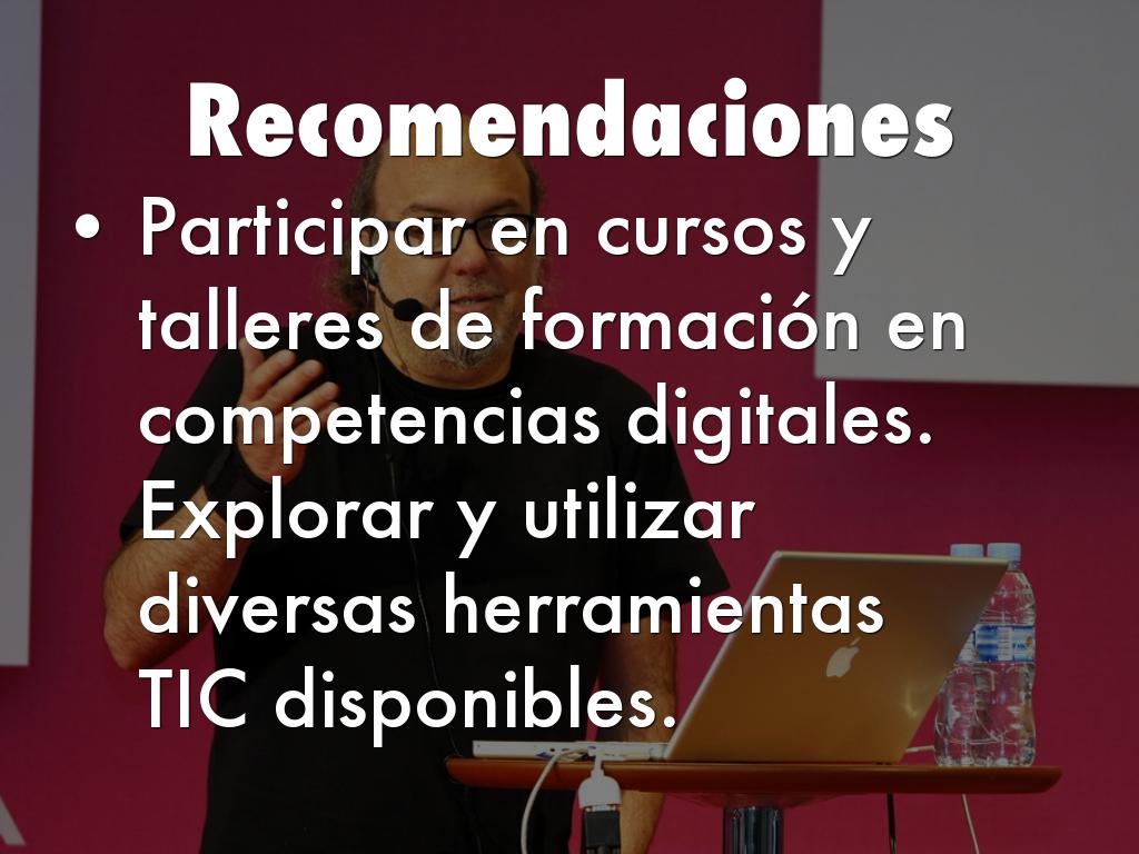 Participar en cursos y talleres de formación en competencias digitales. Explorar y utilizar diversas herramientas TIC disponibles.