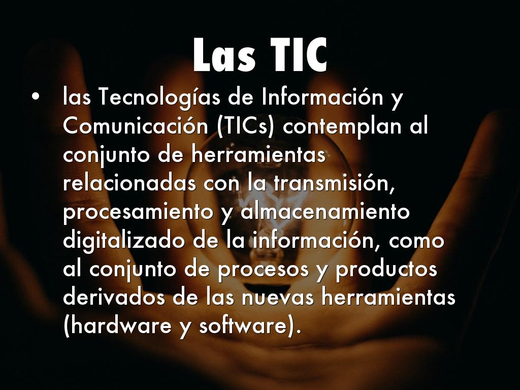 las Tecnologías de Información y Comunicación (TICs) contemplan al conjunto de herramientas relacionadas con la transmisión, procesamiento y almacenamiento digitalizado de la información, como al conjunto de procesos y productos derivados de las nuevas herramientas (hardware y software).