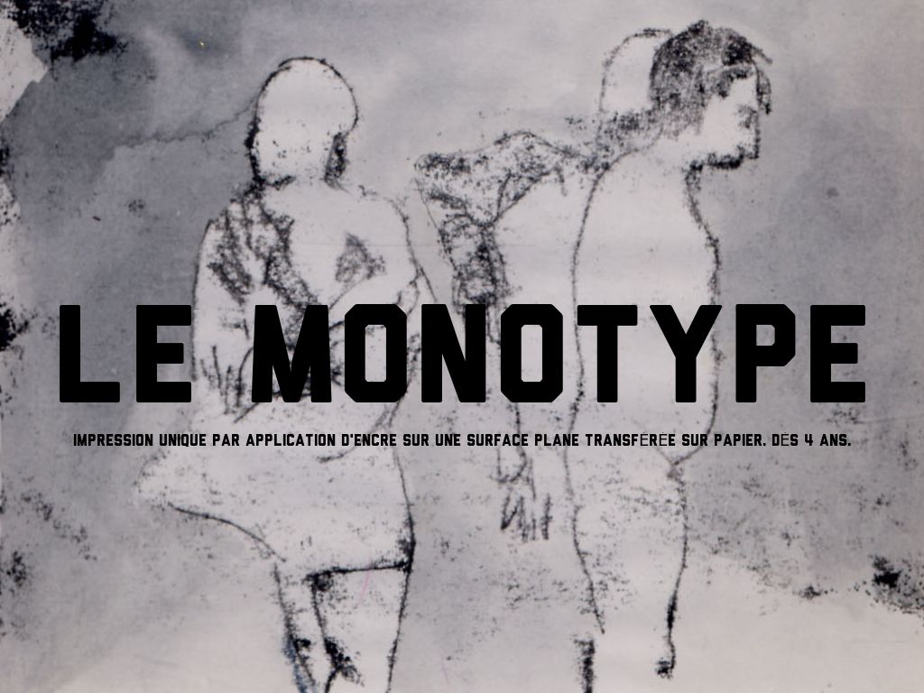 Impression unique par application d'encre sur une surface plane transférée sur papier. Dès 4 ans.