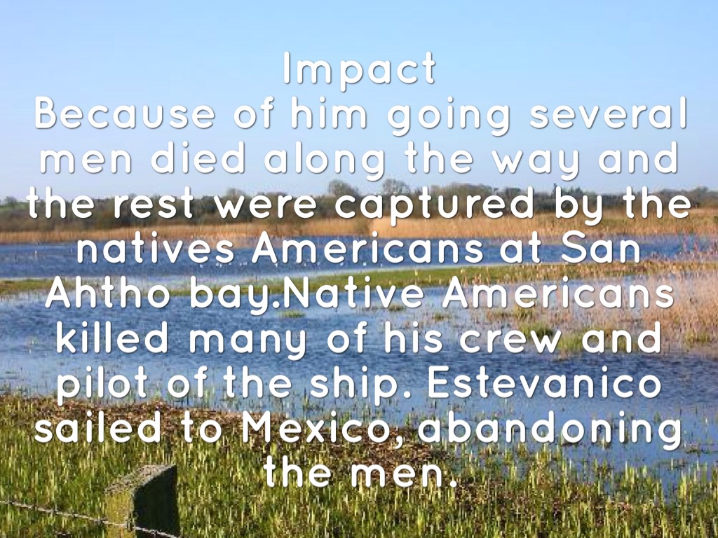 Because of him going several men died along the way and the rest were captured by the natives Americans at San Ahtho bay.Native Americans killed many of his crew and pilot of the ship. Estevanico sailed to Mexico, abandoning the men.