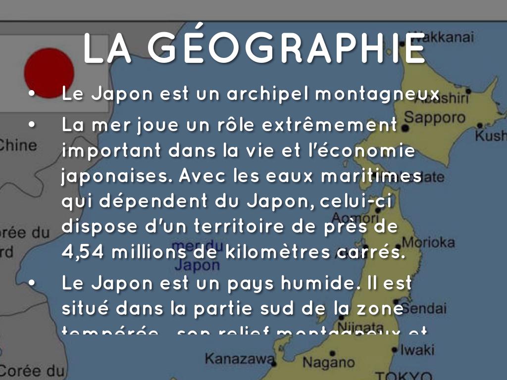 • La mer joue un rôle extrêmement important dans la vie et l'économie japonaises. Avec les eaux maritimes qui dépendent du Japon, celui-ci dispose d'un territoire de près de 4,54 millions de kilomètres carrés.