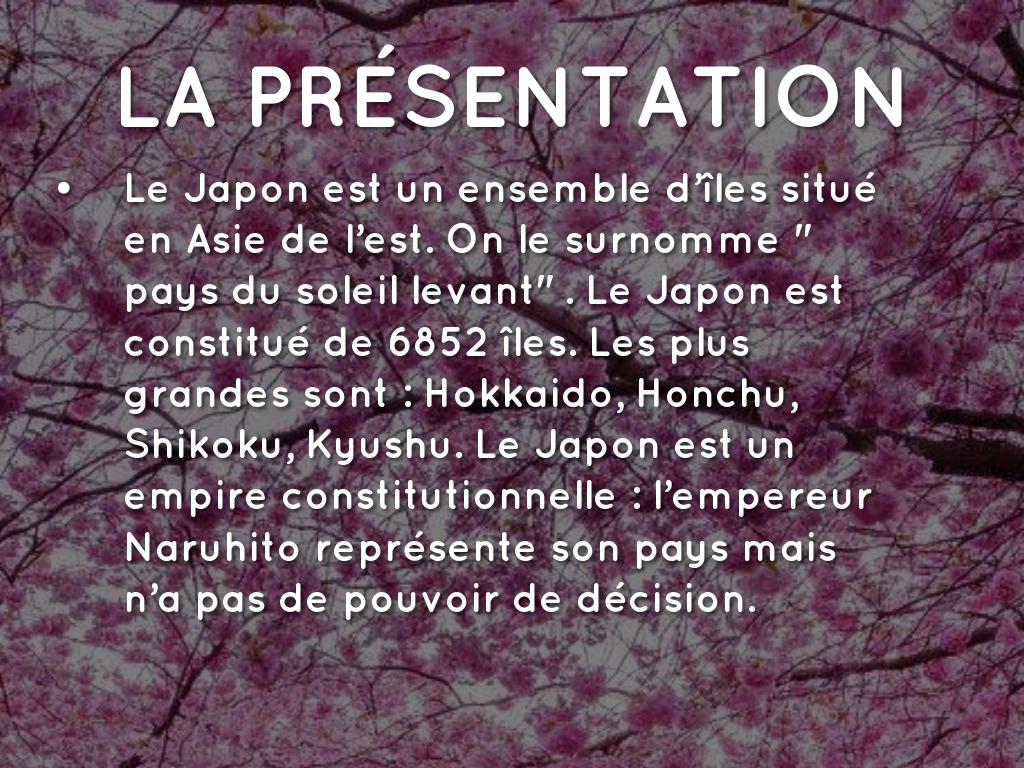 • Le Japon est un ensemble d’îles situé en Asie de l’est. On le surnomme " pays du soleil levant" . Le Japon est constitué de 6852 îles. Les plus grandes sont : Hokkaido, Honchu, Shikoku, Kyushu. Le Japon est un empire constitutionnelle : l’empereur Naruhito représente son pays mais n’a pas de pouvoir de décision.