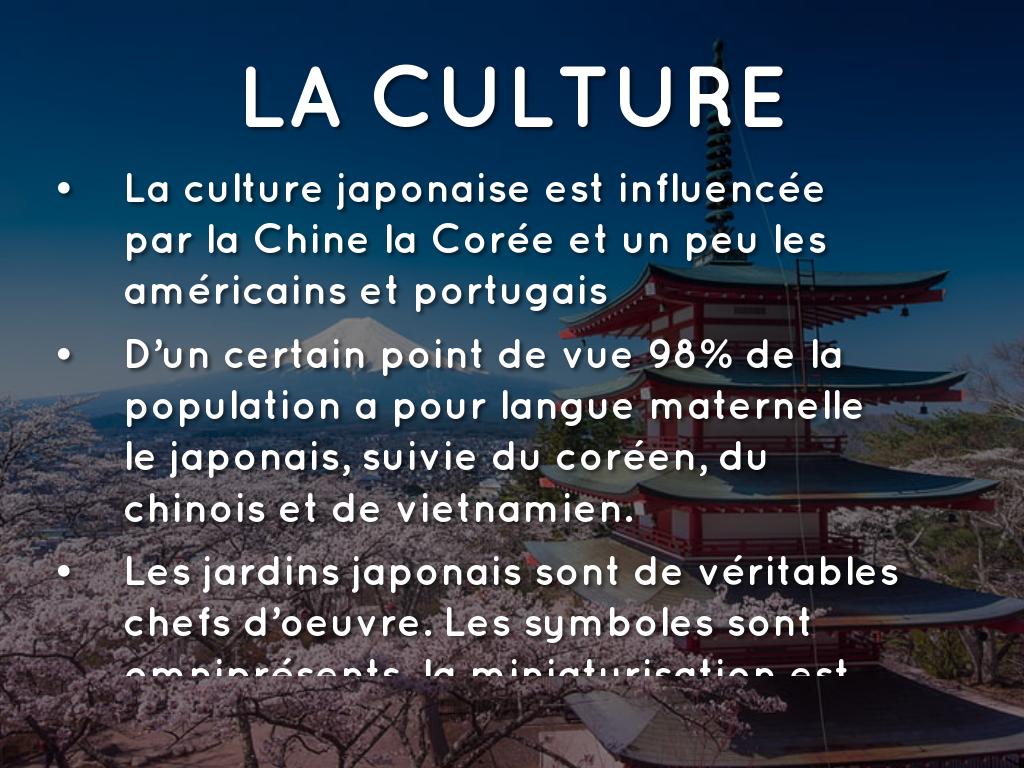 • La culture japonaise est influencée par la Chine la Corée et un peu les américains et portugais