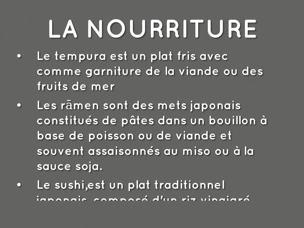 • Le tempura est un plat fris avec comme garniture de la viande ou des fruits de mer