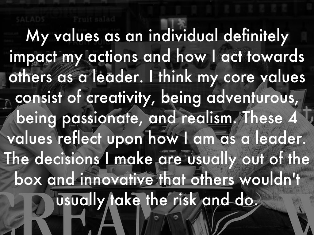 My values as an individual definitely impact my actions and how I act towards others as a leader. I think my core values consist of creativity, being adventurous, being passionate, and realism. These 4 values reflect upon how I am as a leader. The decisions I make are usually out of the box and innovative that others wouldn't usually take the risk and do.