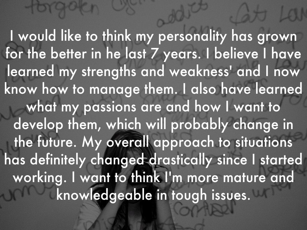 I would like to think my personality has grown for the better in he last 7 years. I believe I have learned my strengths and weakness' and I now know how to manage them. I also have learned what my passions are and how I want to develop them, which will probably change in the future. My overall approach to situations has definitely changed drastically since I started working. I want to think I'm more mature and knowledgeable in tough issues.