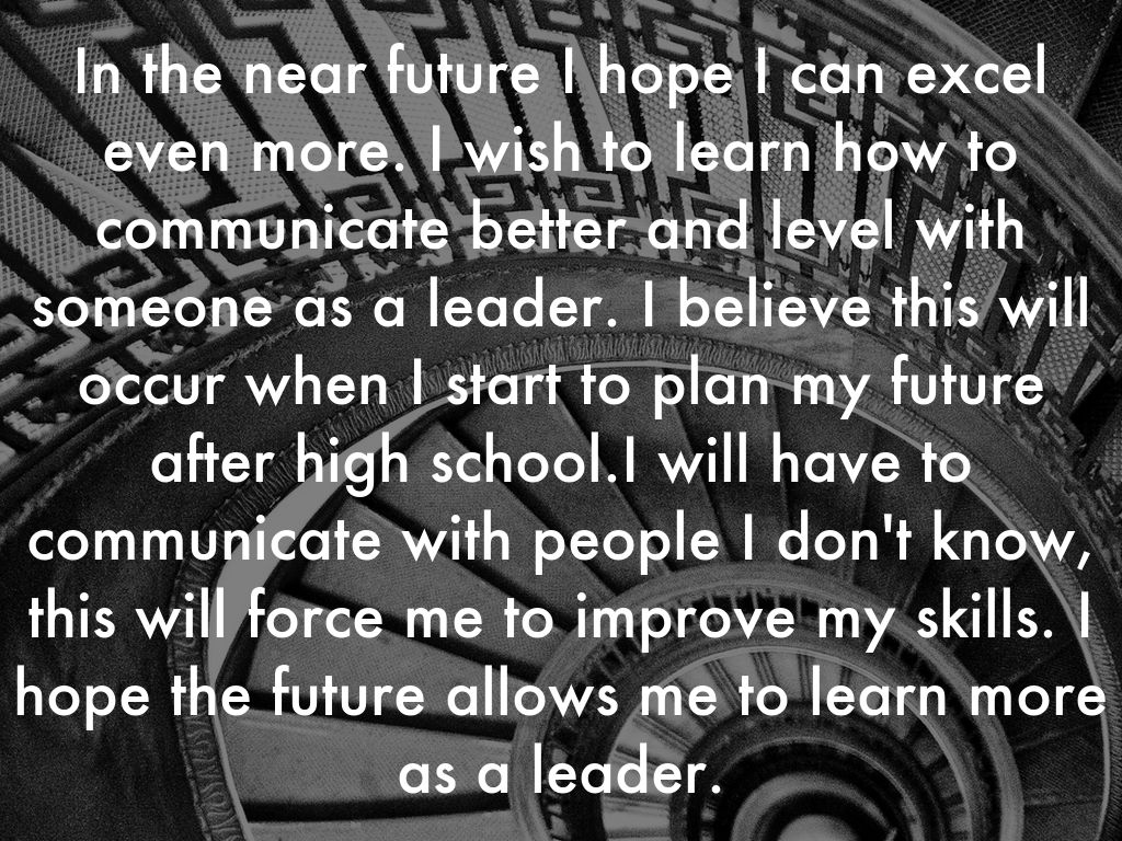 In the near future I hope I can excel even more. I wish to learn how to communicate better and level with someone as a leader. I believe this will occur when I start to plan my future after high school.I will have to communicate with people I don't know, this will force me to improve my skills. I hope the future allows me to learn more as a leader.