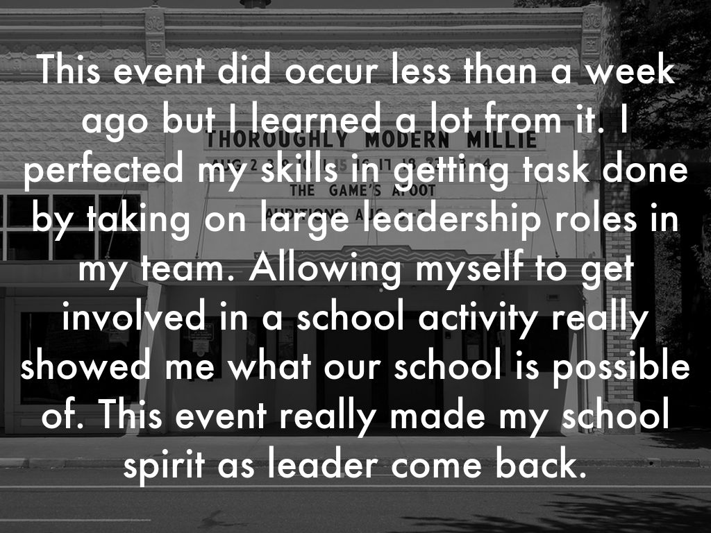 This event did occur less than a week ago but I learned a lot from it. I perfected my skills in getting task done by taking on large leadership roles in my team. Allowing myself to get involved in a school activity really showed me what our school is possible of. This event really made my school spirit as leader come back.