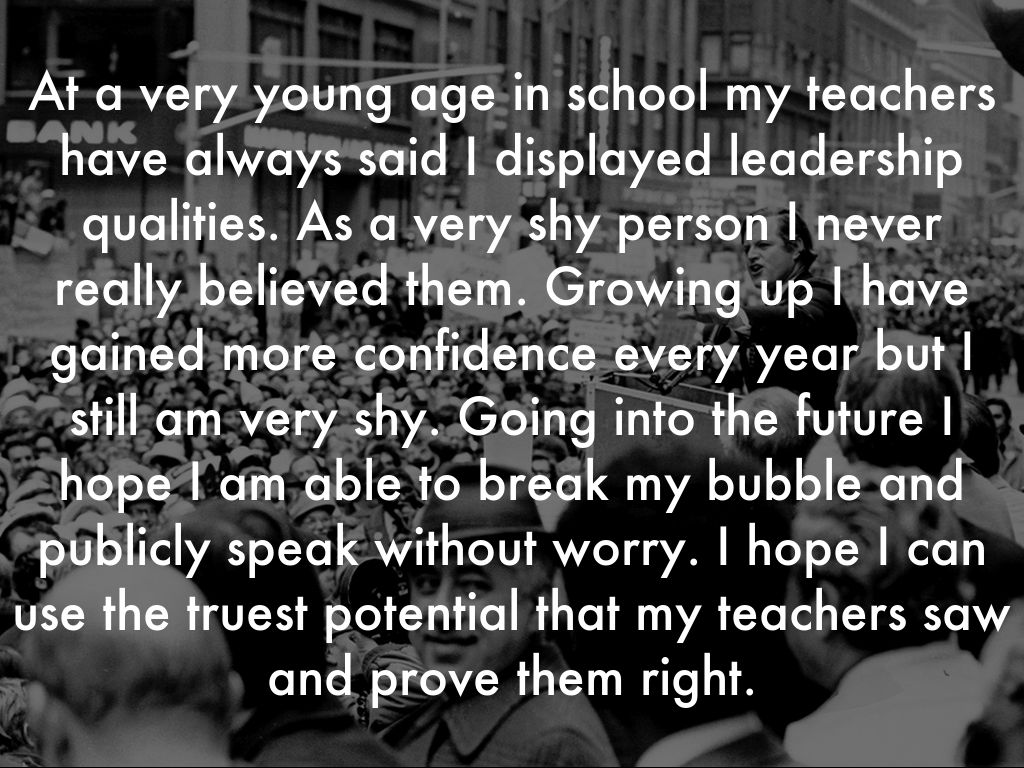 At a very young age in school my teachers have always said I displayed leadership qualities. As a very shy person I never really believed them. Growing up I have gained more confidence every year but I still am very shy. Going into the future I hope I am able to break my bubble and publicly speak without worry. I hope I can use the truest potential that my teachers saw and prove them right.