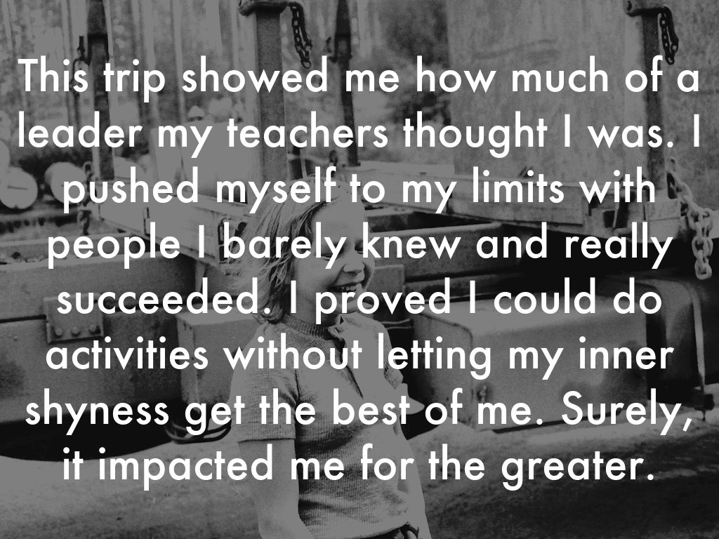 This trip showed me how much of a leader my teachers thought I was. I pushed myself to my limits with people I barely knew and really succeeded. I proved I could do activities without letting my inner shyness get the best of me. Surely, it impacted me for the greater.