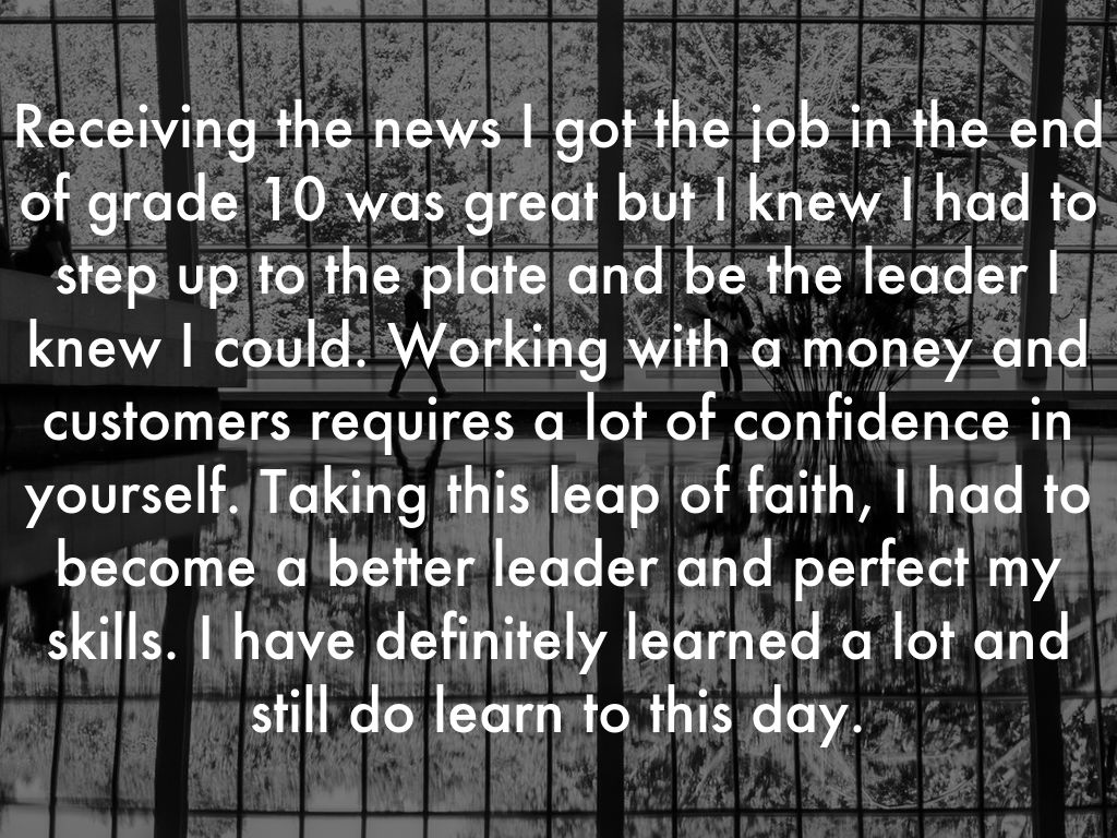 Receiving the news I got the job in the end of grade 10 was great but I knew I had to step up to the plate and be the leader I knew I could. Working with a money and customers requires a lot of confidence in yourself. Taking this leap of faith, I had to become a better leader and perfect my skills. I have definitely learned a lot and still do learn to this day.
