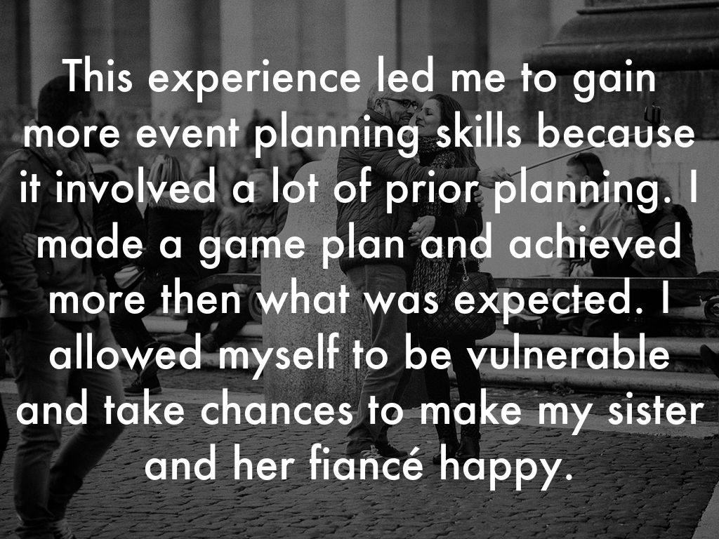 This experience led me to gain more event planning skills because it involved a lot of prior planning. I made a game plan and achieved more then what was expected. I allowed myself to be vulnerable and take chances to make my sister and her fiancé happy.