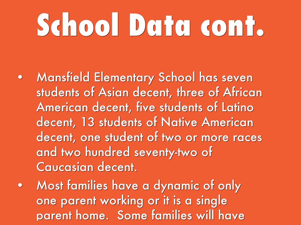 Mansfield Elementary School has seven students of Asian decent, three of African American decent, five students of Latino decent, 13 students of Native American decent, one student of two or more races and two hundred seventy-two of Caucasian decent.