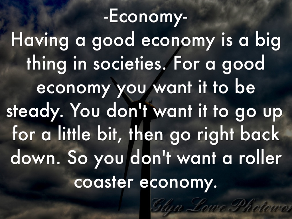 -Economy- Having a good economy is a big thing in societies. For a good economy you want it to be steady. You don't want it to go up for a little bit, then go right back down. So you don't want a roller coaster economy.