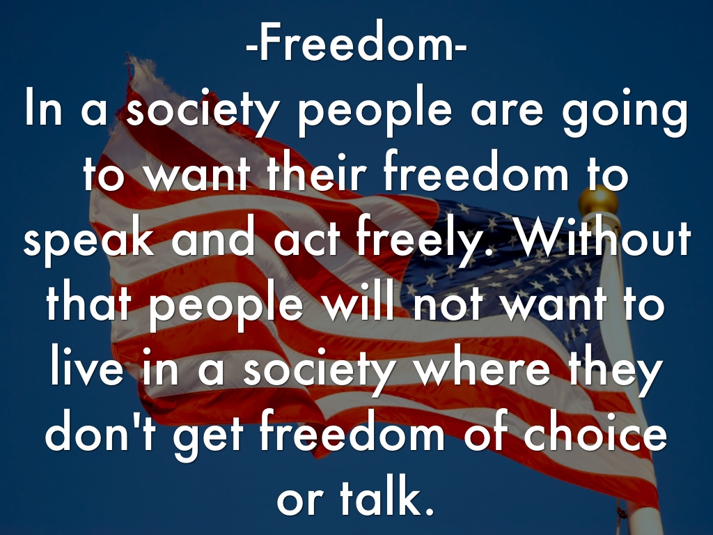 -Freedom- In a society people are going to want their freedom to speak and act freely. Without that people will not want to live in a society where they don't get freedom of choice or talk.