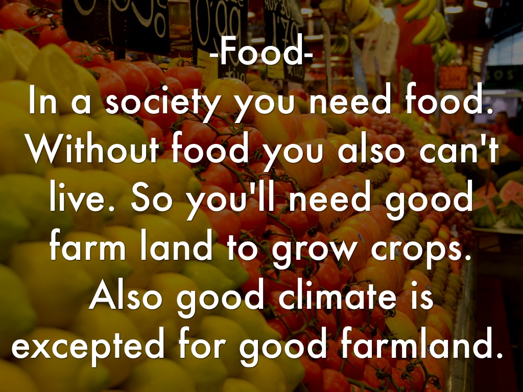 -Food- In a society you need food. Without food you also can't live. So you'll need good farm land to grow crops. Also good climate is excepted for good farmland.