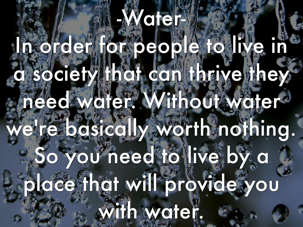 -Water- In order for people to live in a society that can thrive they need water. Without water we're basically worth nothing. So you need to live by a place that will provide you with water.