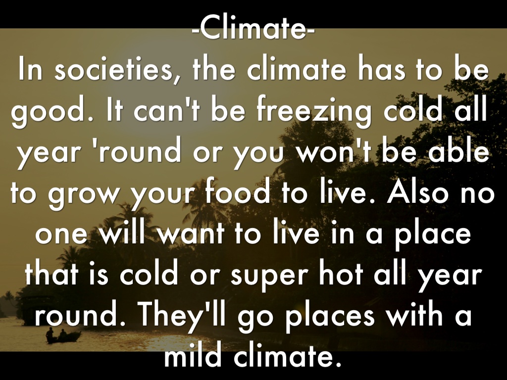 -Climate- In societies, the climate has to be good. It can't be freezing cold all year 'round or you won't be able to grow your food to live. Also no one will want to live in a place that is cold or super hot all year round. They'll go places with a mild climate.