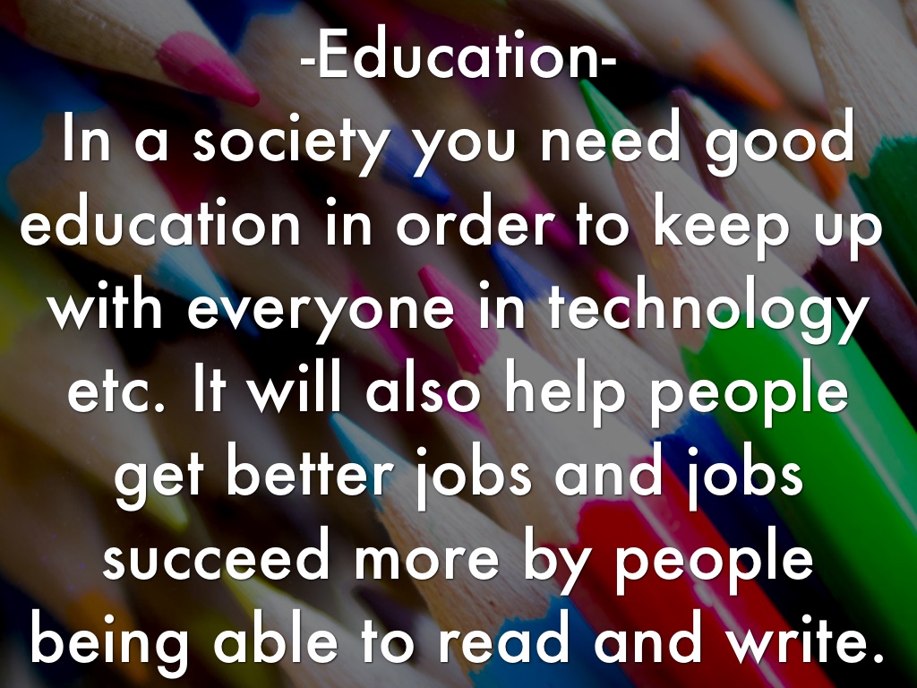 -Education- In a society you need good education in order to keep up with everyone in technology etc. It will also help people get better jobs and jobs succeed more by people being able to read and write.