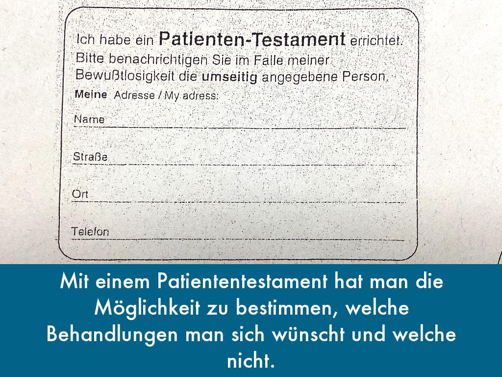 Mit einem Patiententestament hat man die Möglichkeit zu bestimmen, welche Behandlungen man sich wünscht und welche nicht. Das ist dann wichtig, wenn man nicht mehr den eigenen Willen äußern kann. Man kann auch angeben wer kontaktiert werden soll, im falle einer Ohnmacht.