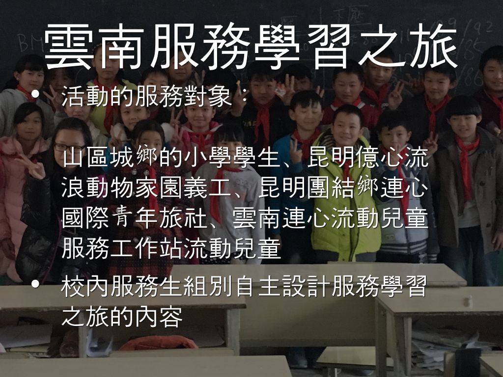 活動的服務對象﹕ 山區城鄉的小學學生、昆明億心流浪動物家園義工、昆明團結鄉連心國際青年旅社、雲南連心流動兒童服務工作站流動兒童