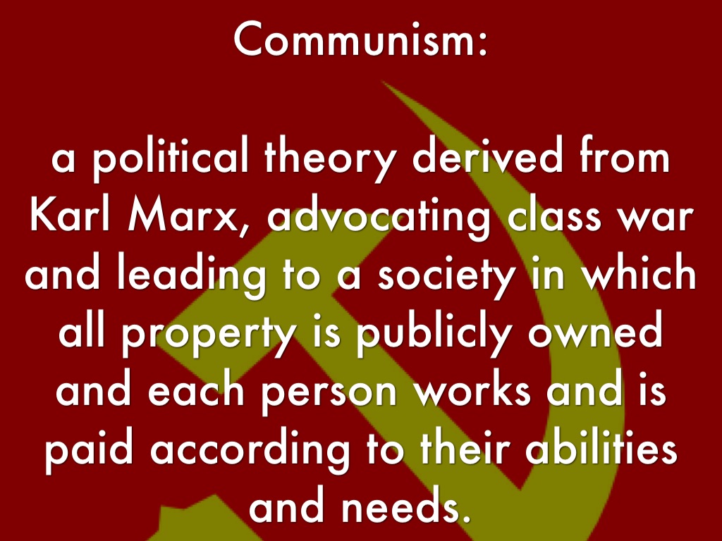 a political theory derived from Karl Marx, advocating class war and leading to a society in which all property is publicly owned and each person works and is paid according to their abilities and needs.