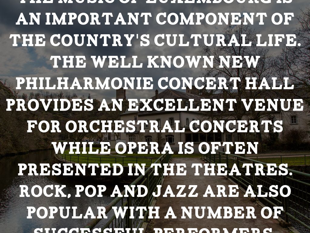 The Music of Luxembourg is an important component of the country's cultural life. The well known new Philharmonie concert hall provides an excellent venue for orchestral concerts while opera is often presented in the theatres. Rock, pop and jazz are also popular with a number of successful performers.