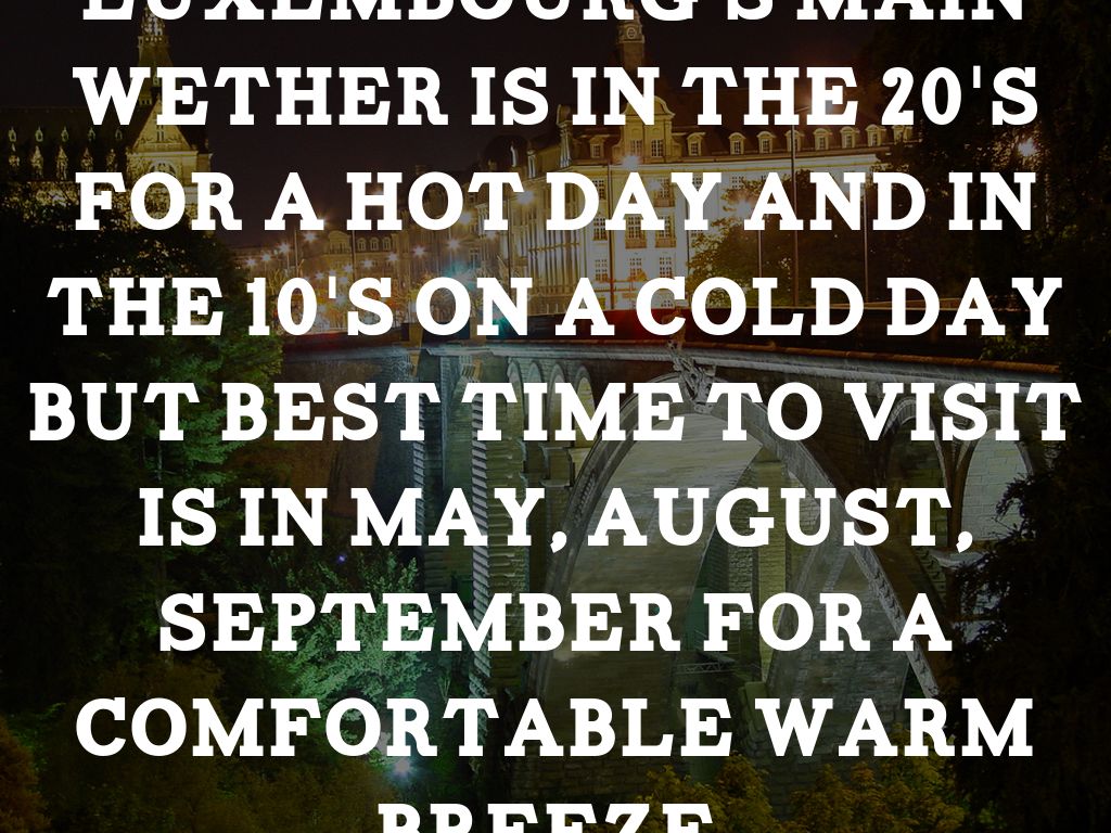 Luxembourg's main wether is in the 20's for a hot day and in the 10's on a cold day but best time to visit is in May, August, September for a Comfortable warm breeze.