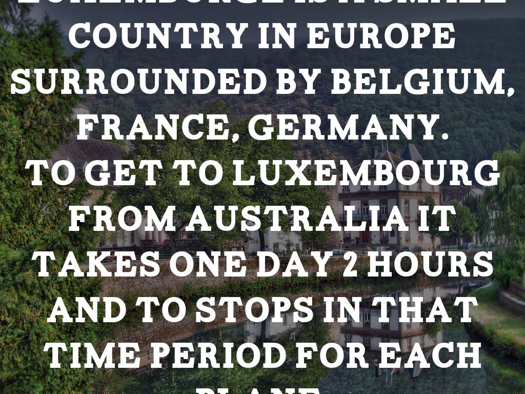 Luxemburge is a small country in Europe surrounded by Belgium, France, Germany. To get to Luxembourg from Australia it takes one day 2 hours and to stops in that time period for each plane.