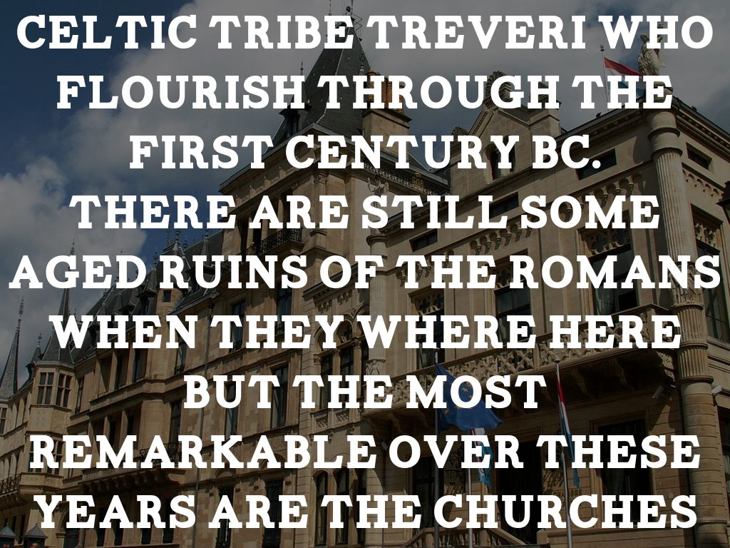 Luxembourg back to the Celtic tribe treveri who flourish through the first century BC. There are still some aged ruins of the Romans when they where here but the most remarkable over these years are the churches and castles.