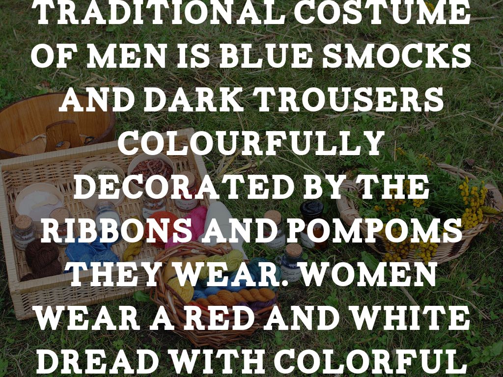 Luxembourg traditional costume of men is blue smocks and dark trousers colourfully decorated by the ribbons and pompoms they wear. Women wear a red and white dread with colorful ribbon as well.