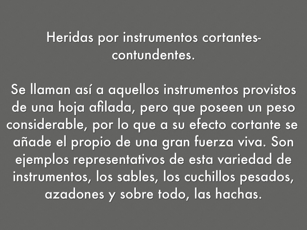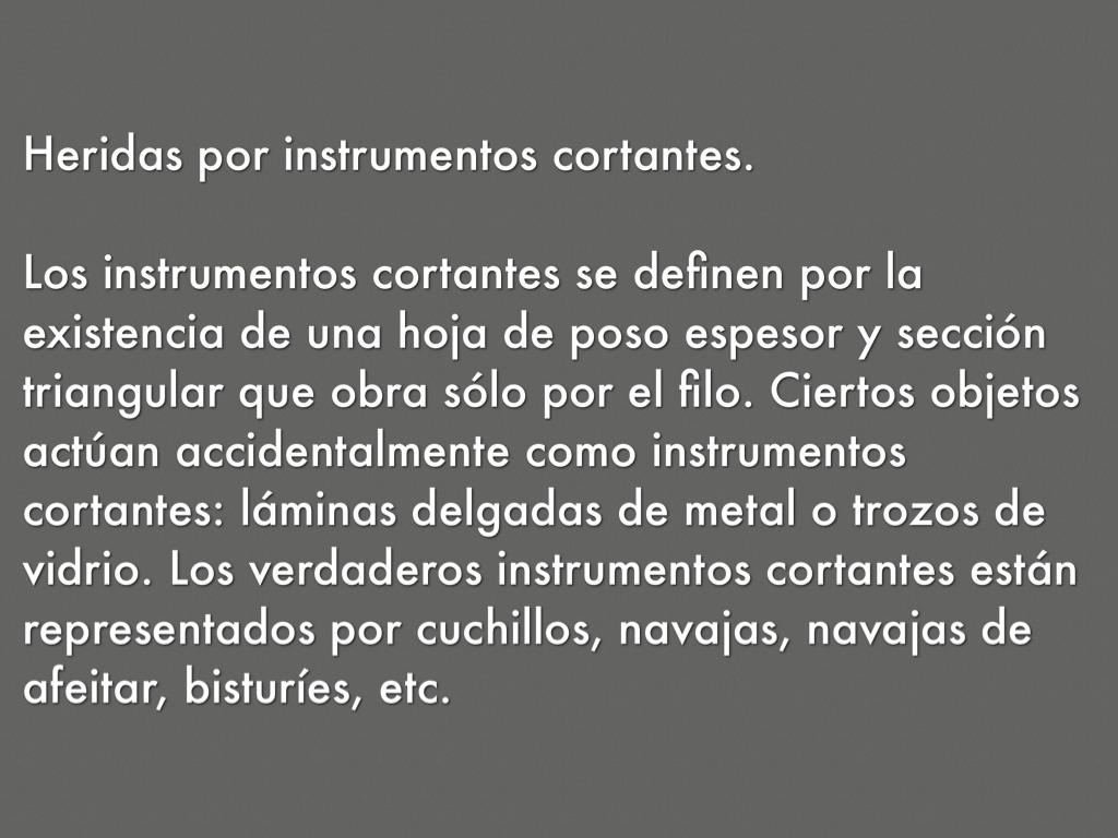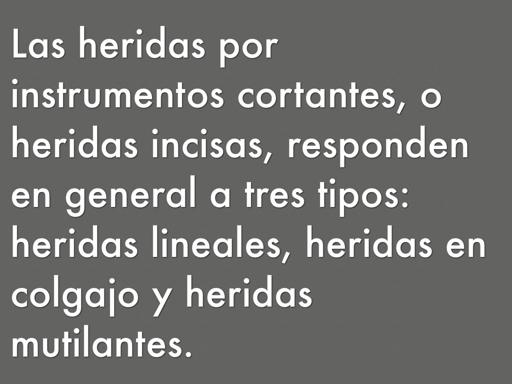 Las heridas por instrumentos cortantes, o heridas incisas, responden en general a tres tipos: heridas lineales, heridas en colgajo y heridas mutilantes.