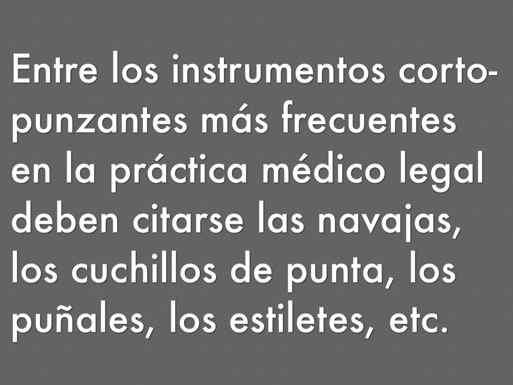 Entre los instrumentos corto-punzantes más frecuentes en la práctica médico legal deben citarse las navajas, los cuchillos de punta, los puñales, los estiletes, etc.